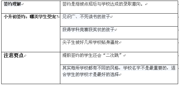 《杭州超限教育中心王小林2015年10月28日訊》小升初簽約一般是指學(xué)校和意向?qū)W生雙方達(dá)成協(xié)議,入學(xué)前的合約。具體詳情理解及哪些類型的孩子易受學(xué)校喜歡見下表: