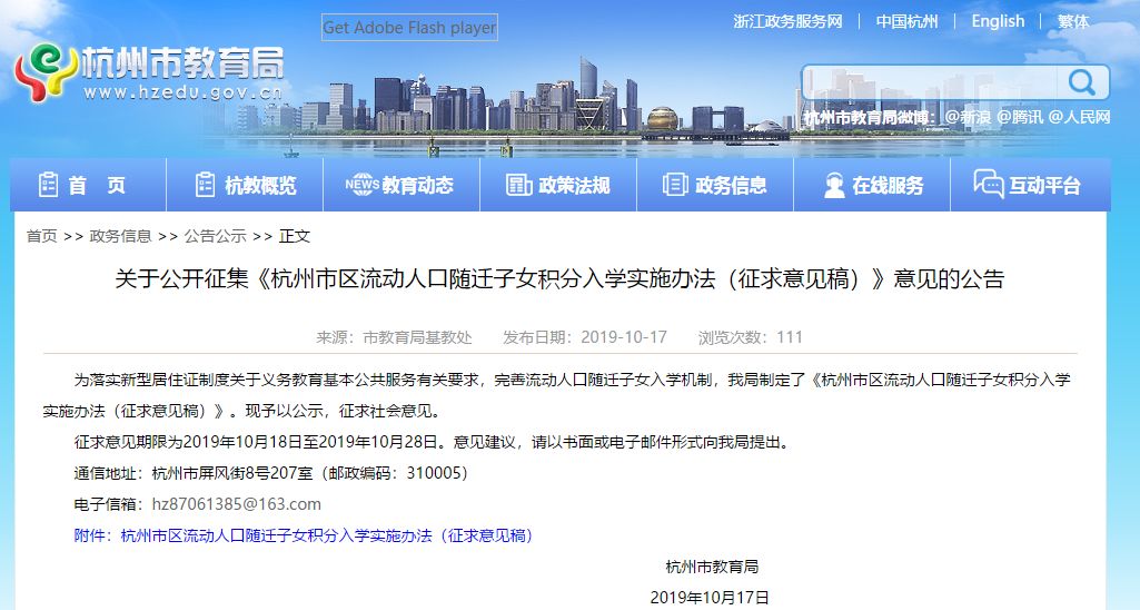 征求意見期限為2019年10月18日至2019年10月28日。意見建議,請以書面或電子郵件形式向杭州市教育局提出。